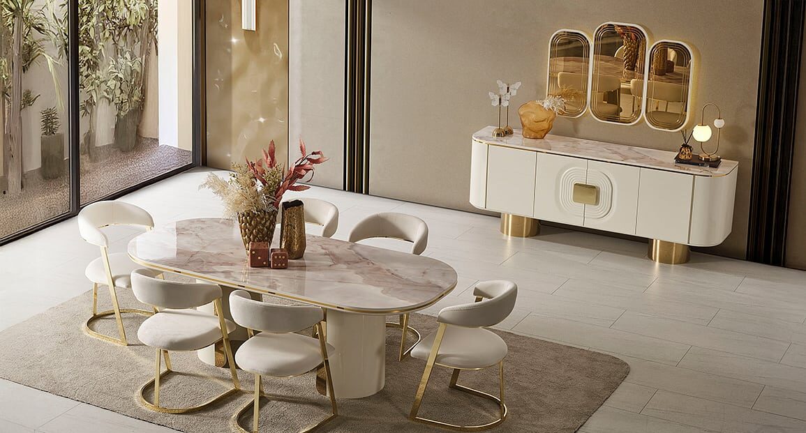 سفرة استانلس دهبى شاملة تربيزة بقرصة رخام كرارة أبيض / 6 كراسي / بوفيه / نيش/ مراية