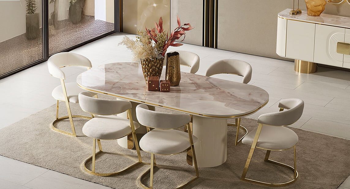 سفرة خشب زان طبيعى × استانلس دهبى شاملة تربيزة بقرصة رخام كرارة أبيض / 6 كراسي